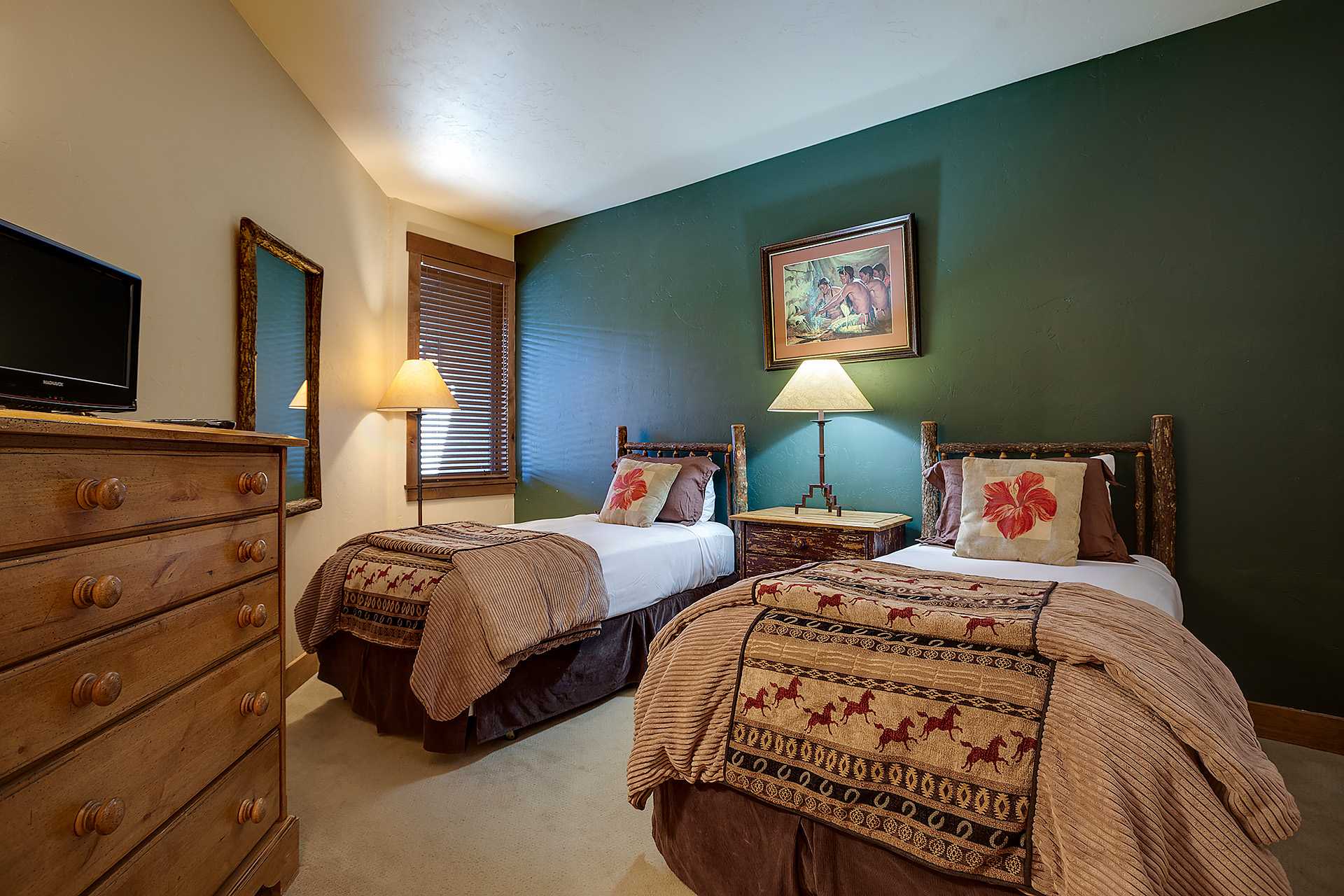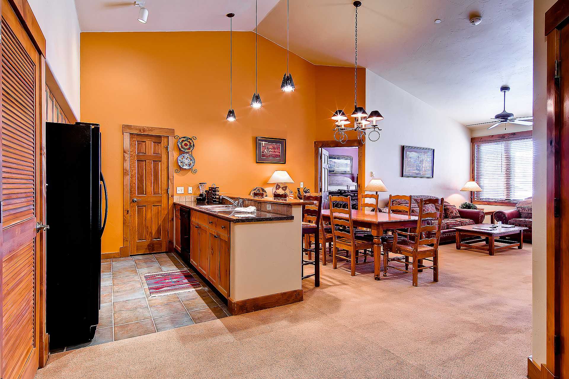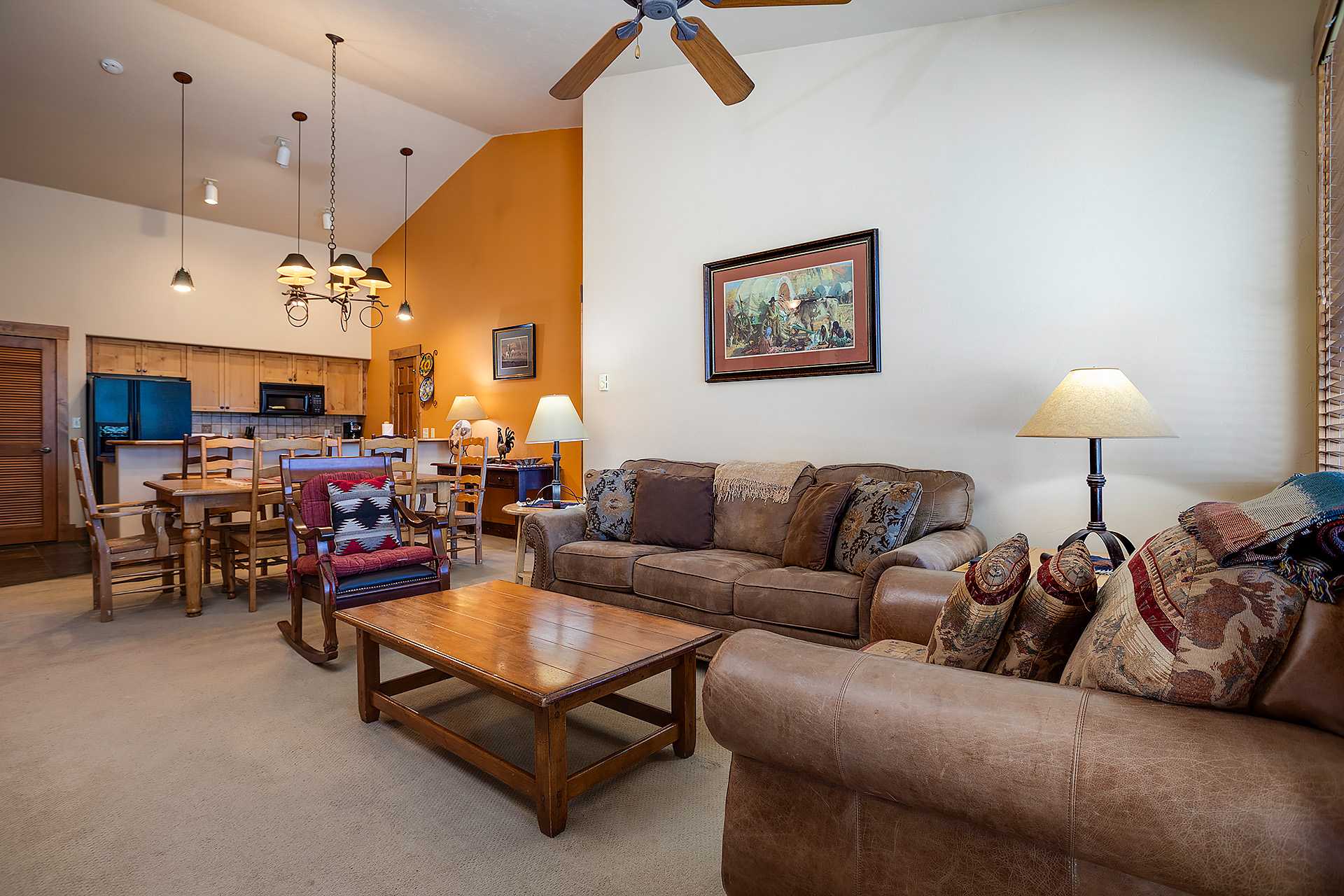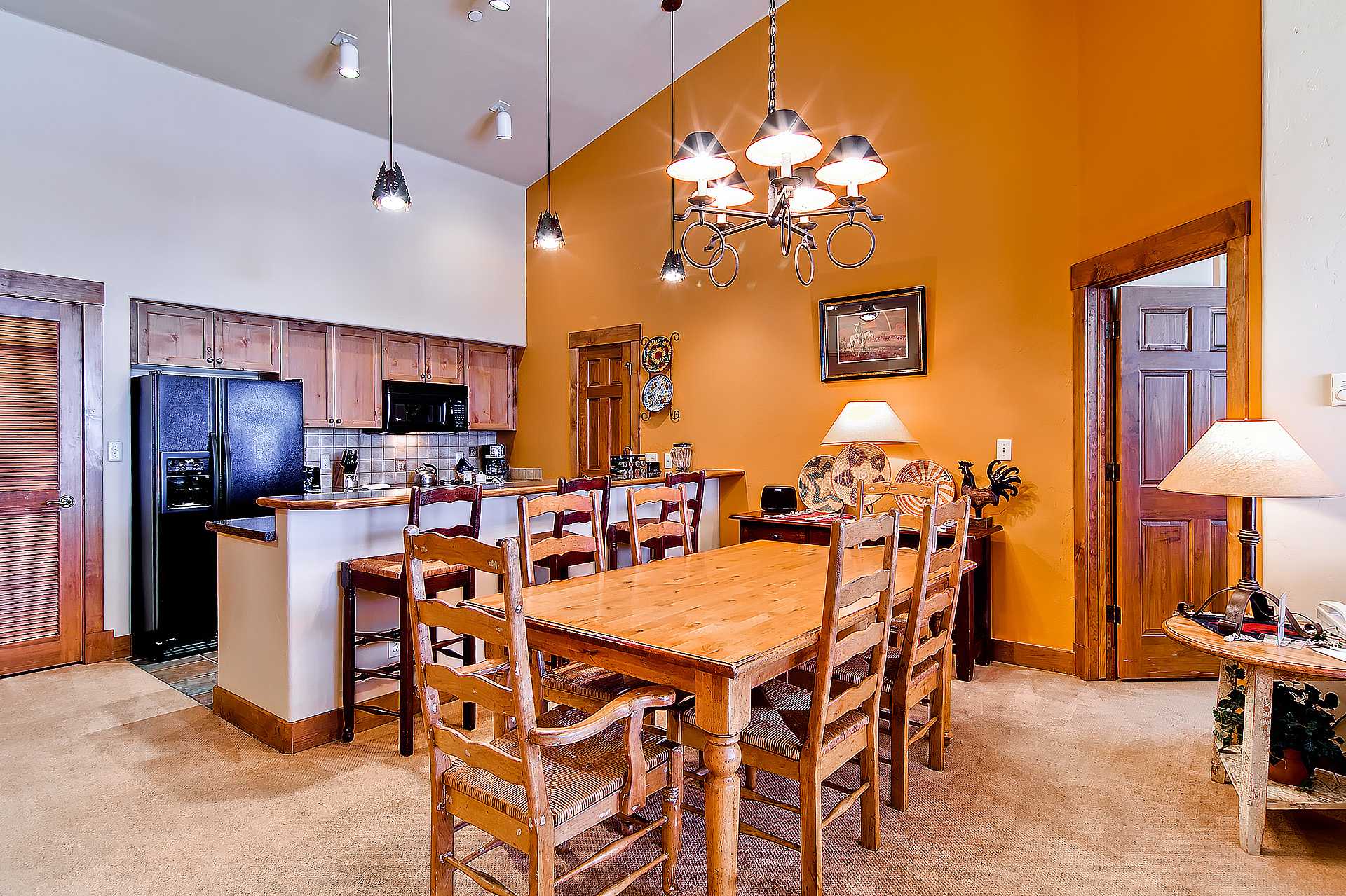 Timberline Lodge 2301 offers true mountain style, with a fun pop of color! This bright, top floor condo has fun accent walls throughout. The spacious main living area is highlighted by lofty vaulted ceilings and plenty of windows allowing for natural light. The fully stocked kitchen features a breakfast bar with seating for three and sleek black appliances throughout, providing everything you need to entertain.